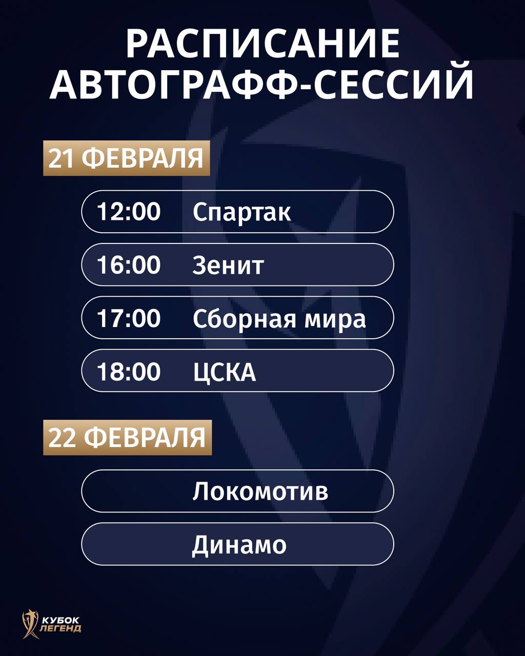 Автограф-сессии с командами ФК «Динамо» и ФК «Локомотив» пройдут 22 февраля. Точное время будет известно позже. Следите за обновлениями на официальном сайте турнира и в социальных сетях.