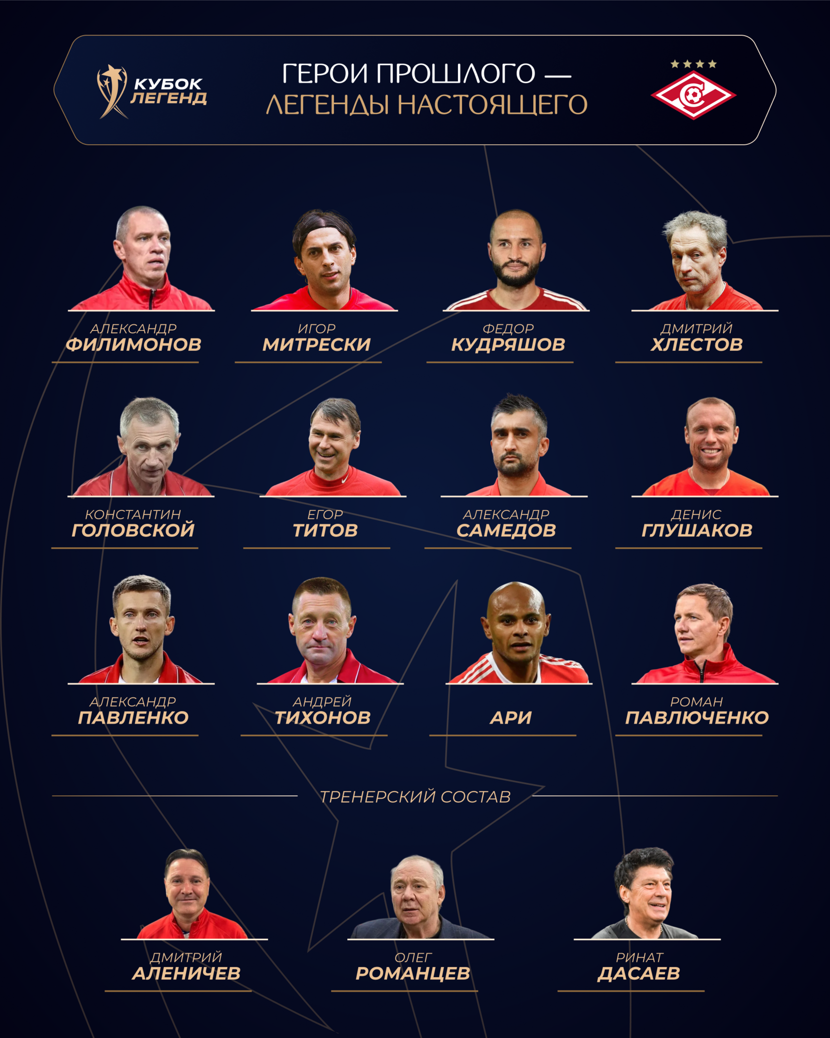 Состав легенд ФК «Спартак»: вратарь – Александр Филимонов, защитники – Дмитрий Хлестов, Федор Кудряшов, Игор Митрески (Македония), полузащитники – Константин Головской, Денис Глушаков, Александр Самедов, Андрей Тихонов, Егор Титов, Александр Павленко, нападающие – Роман Павлюченко, Ари (Бразилия/Россия). Тренеры – Олег Романцев, Ринат Дасаев, Дмитрий Аленичев.